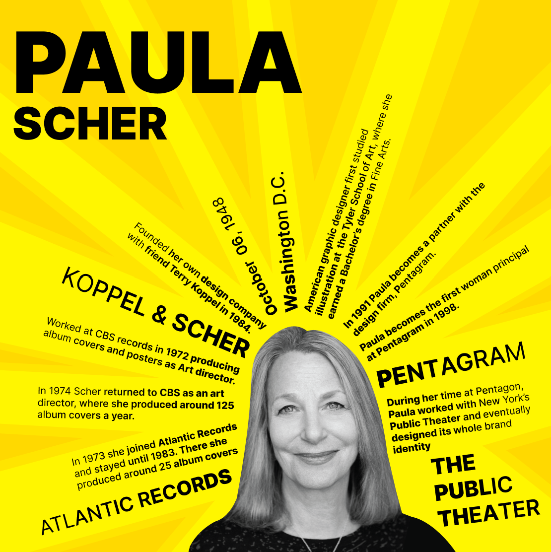 Paula Scher's contributions to the field of typography have expanded the possibilities of how type can be used to communicate messages, evoke emotions, and engage audiences. She encouraged a more experimental approach to design and typography, advocating for embracing mistakes as a learning process. Her philosophy, as she said in 1995 is that “It's through mistakes that you actually can grow. You have to get bad in order to get good,” has inspired countless designers to take risks and push boundaries in their own work.