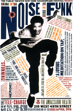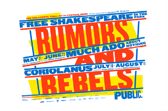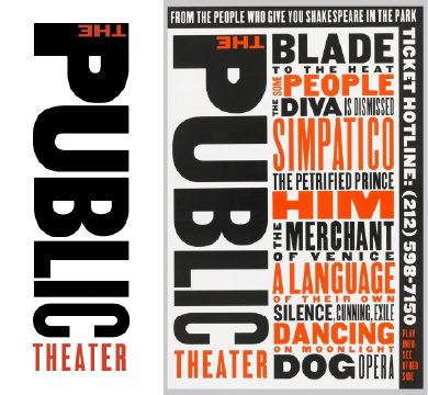 In this poster, the composition of the text is interesting because it adds movement and playfulness to the piece. Another element that attracts attention is the color of the text. Paula Scher is known for her use of bold colors, which are noticeable in this poster. She uses bright blue, red, black and purple throughout. This is a poster that Paula Scher designed for New York’s Public Theatre for the musical Bring in da noise, Bring in da funk. In this poster Paula breaks the traditional grid to rotate text to fit around the center image. Even if the text in the middle is not as readable, the most important information has a clear position in the hierarchy, the theatre’s name and the title of the play are at the top of the page, while the time and place are at the bottom. To make the title seem playful, she changes the width of each letter of the title and rotates some text. The tilted text gives more movement and emotion to the poster, which also fits with the image of the man jumping. Also, most of the text is placed around the central image without touching it. The only time when the image overlaps with the text is in the title, where the man’s sleeve covers a part of the letter N.